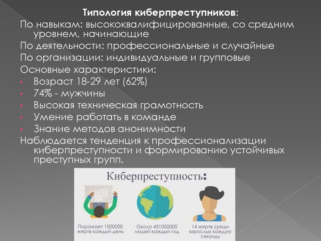 Типология киберпреступников:По навыкам: высококвалифицированные, со средним