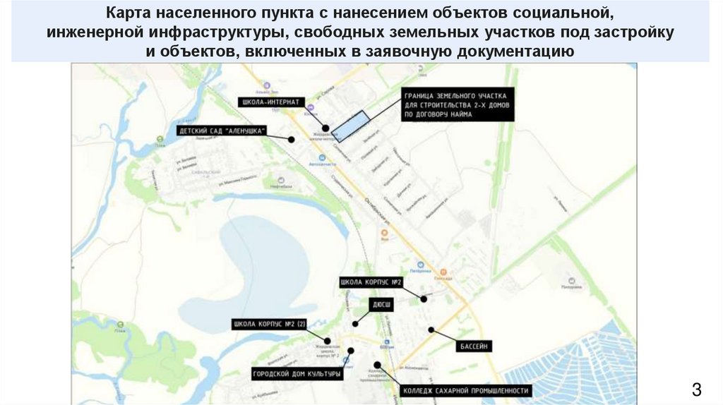 Карта населенного пункта с нанесением объектов социальной,инженерной инфраструктуры, свободных земельных участков под застройку