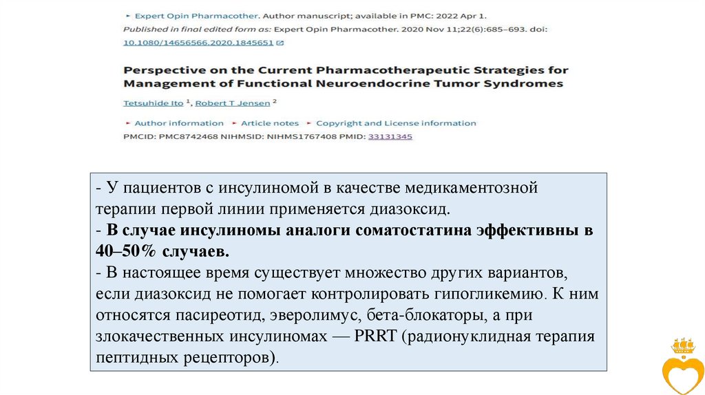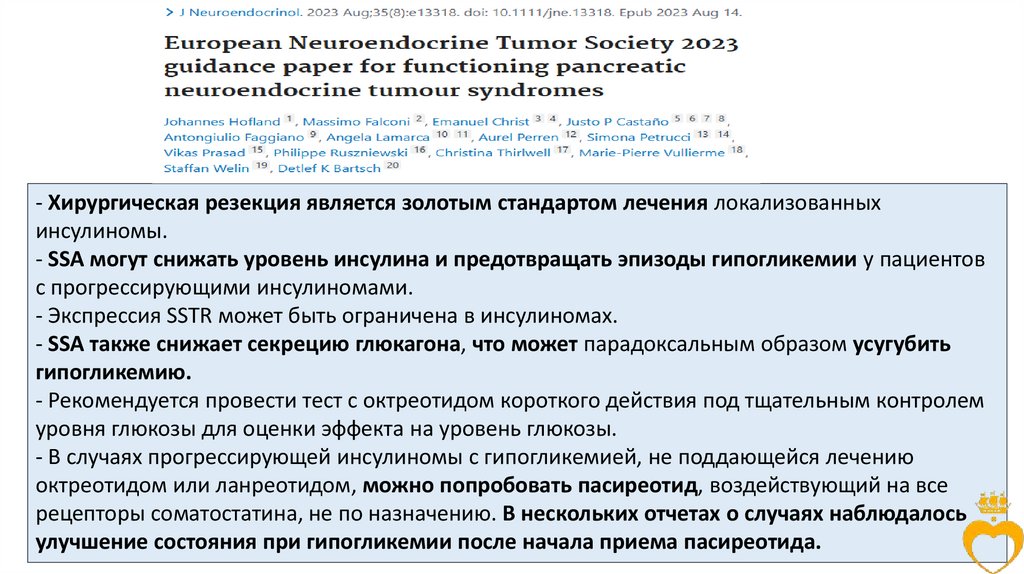 • Учитывая аритмогенный эффект, пациентов с инсулиномами следует относить к