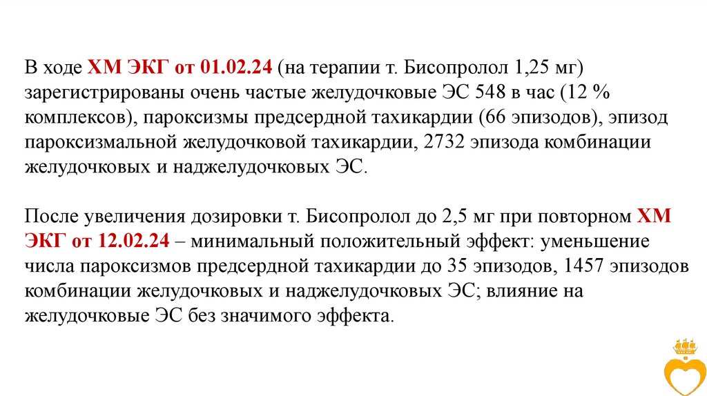 В ходе ХМ ЭКГ от 01.02.24 (на терапии т. Бисопролол 1,25 мг)зарегистрированы очень частые желудочковые ЭС 548 в час (12 %