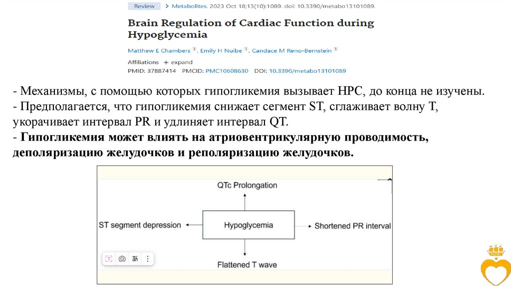- Механизмы, с помощью которых гипогликемия вызывает НРС, до конца не изучены.- Предполагается, что гипогликемия снижает сегмент ST, сглаживает волну T,