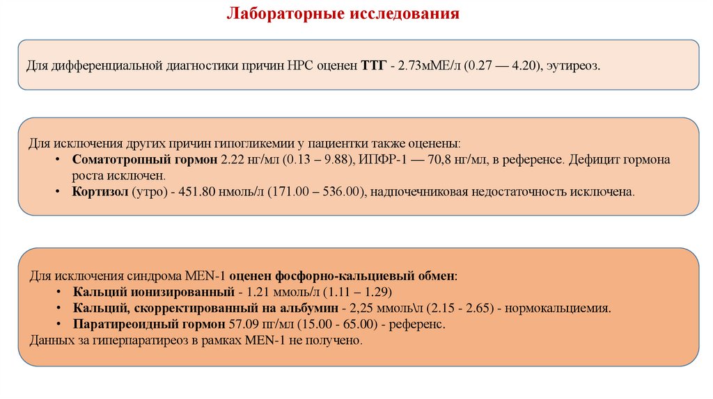 Для исключения других причин гипогликемии у пациентки также оценены: