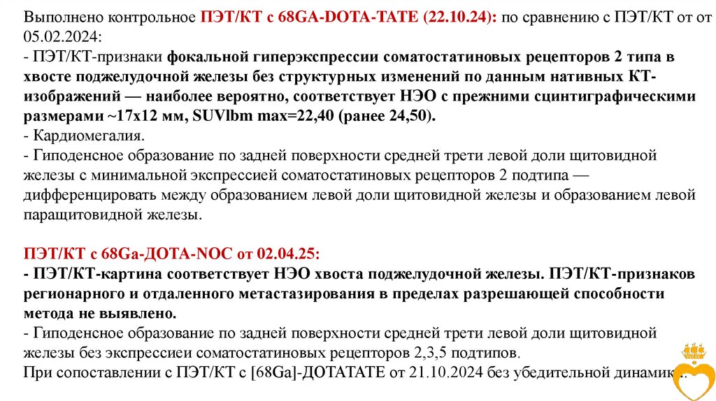 Выполнено контрольное ПЭТ/КТ с 68GA-DOTA-TATE (22.10.24): по сравнению с ПЭТ/КТ от от05.02.2024: