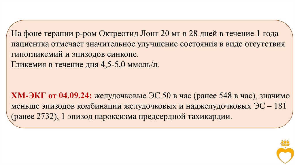 соматостатина, контроль СМ-ЭКГ через 3 мес на фоне эугликемии, повторное решение