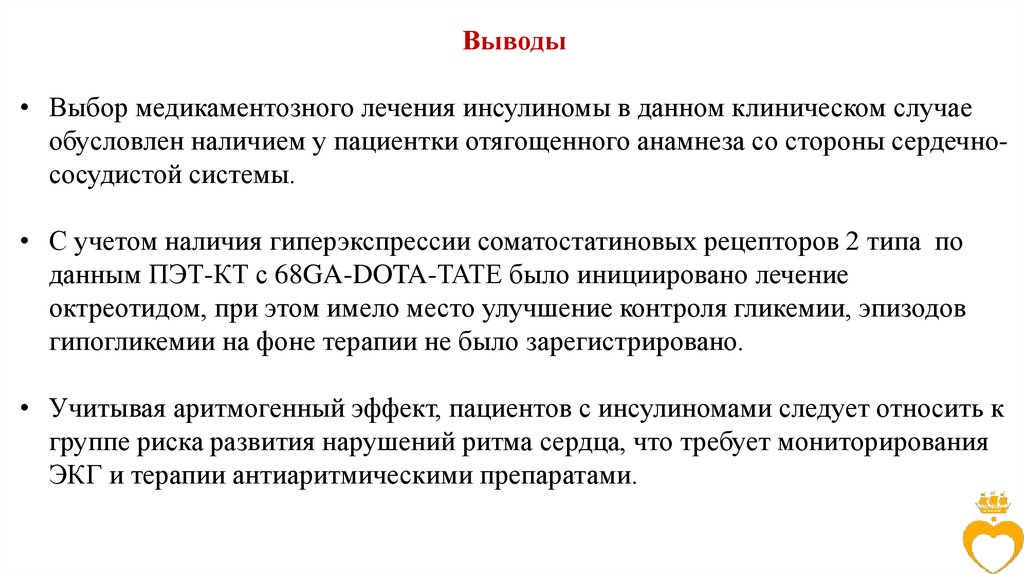 Выводы• Выбор медикаментозного лечения инсулиномы в данном клиническом случае