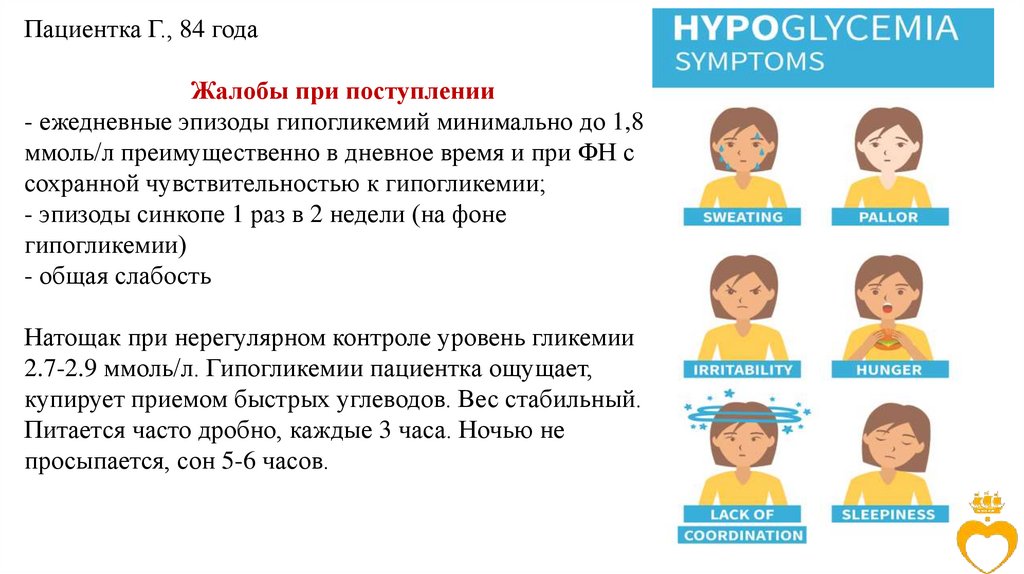симптомы гипогликемии + купирование гипогликемии.