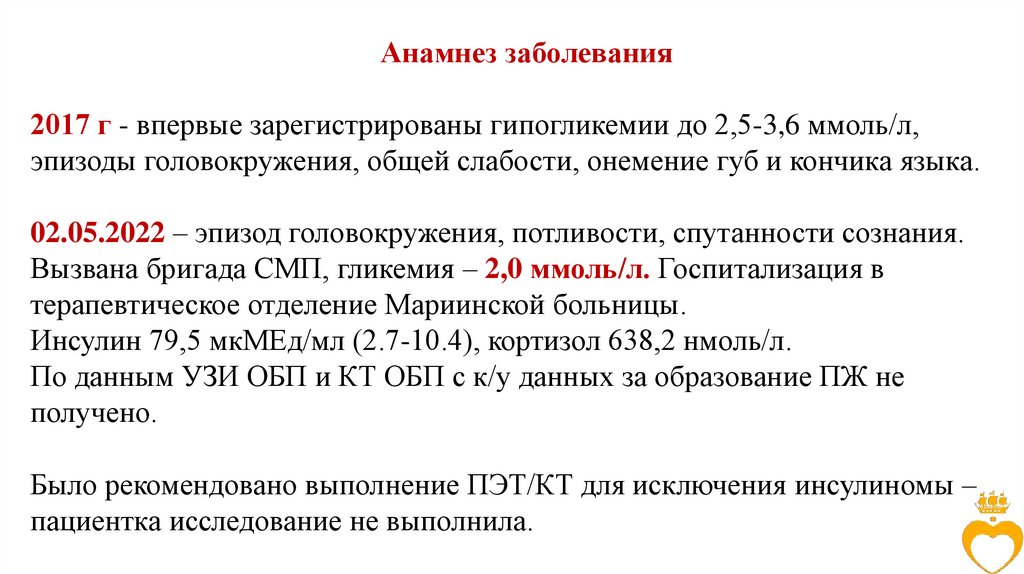 Анамнез заболевания2017 г - впервые зарегистрированы гипогликемии до 2,5-3,6 ммоль/л,