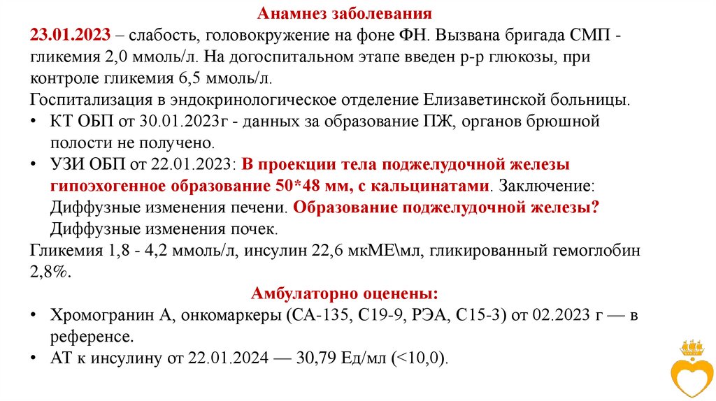 Анамнез заболевания23.01.2023 – слабость, головокружение на фоне ФН. Вызвана бригада СМП гликемия 2,0 ммоль/л. На догоспитальном этапе введен р-р глюкозы, при