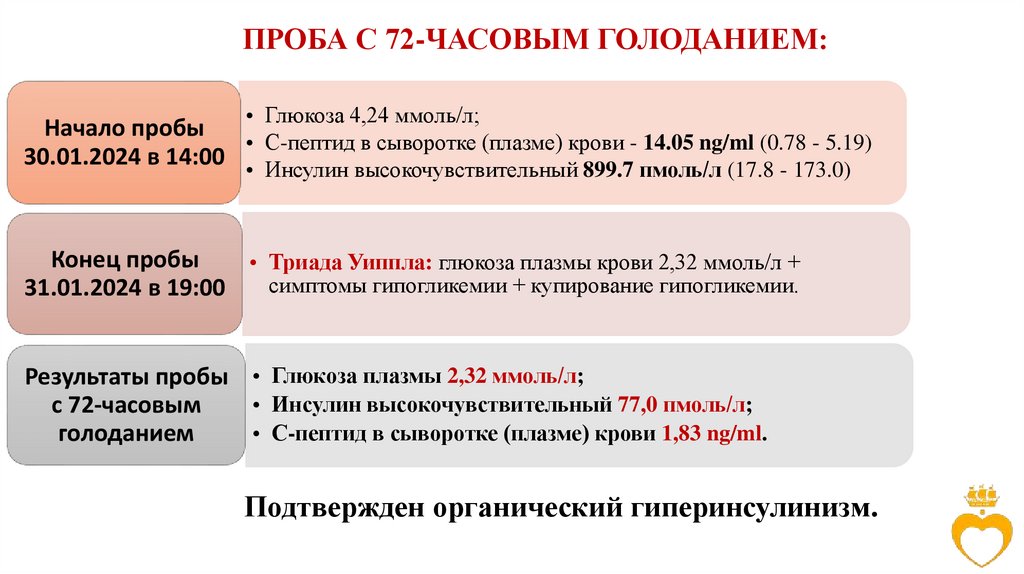 ПРОБА С 72-ЧАСОВЫМ ГОЛОДАНИЕМ:• Глюкоза 4,24 ммоль/л;