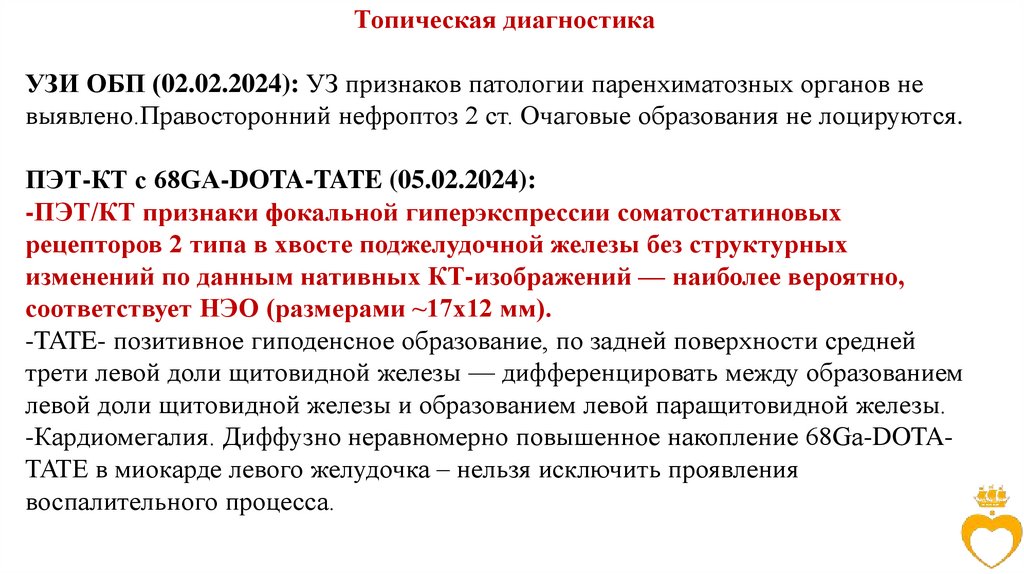 - ПЭТ/КТ-картина соответствует НЭО хвоста поджелудочной железы. ПЭТ/КТ-признаков