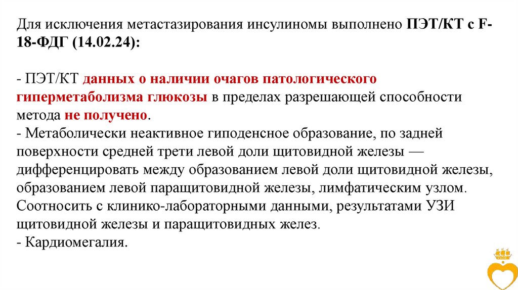 Для исключения метастазирования инсулиномы выполнено ПЭТ/КТ с F18-ФДГ (14.02.24):- ПЭТ/КТ данных о наличии очагов патологического