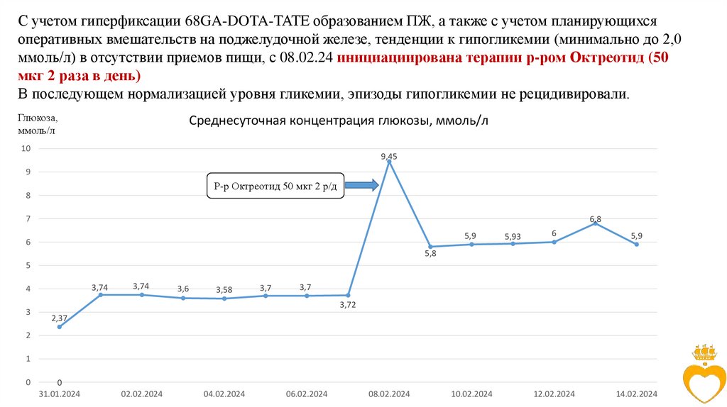 С учетом гиперфиксации 68GA-DOTA-TATE образованием ПЖ, а также с учетом планирующихсяоперативных вмешательств на поджелудочной железе, тенденции к гипогликемии (минимально до 2,0