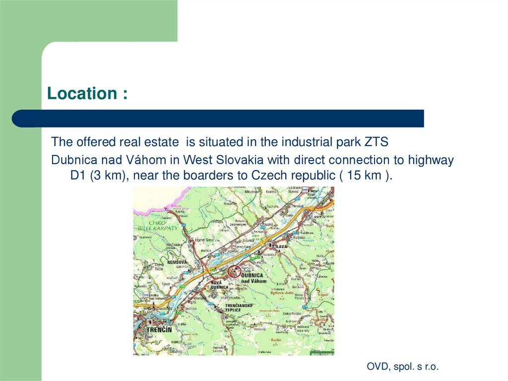 The offered real estate is situated in the industrial park ZTSDubnica nad Váhom in West Slovakia with direct connection to highway