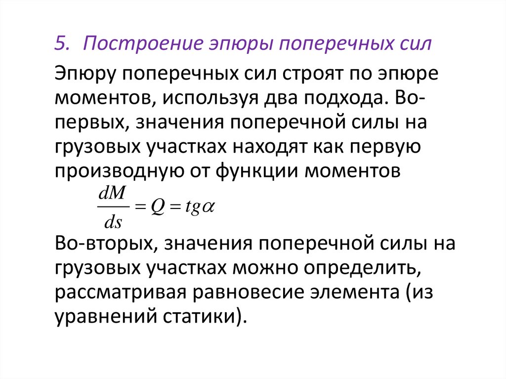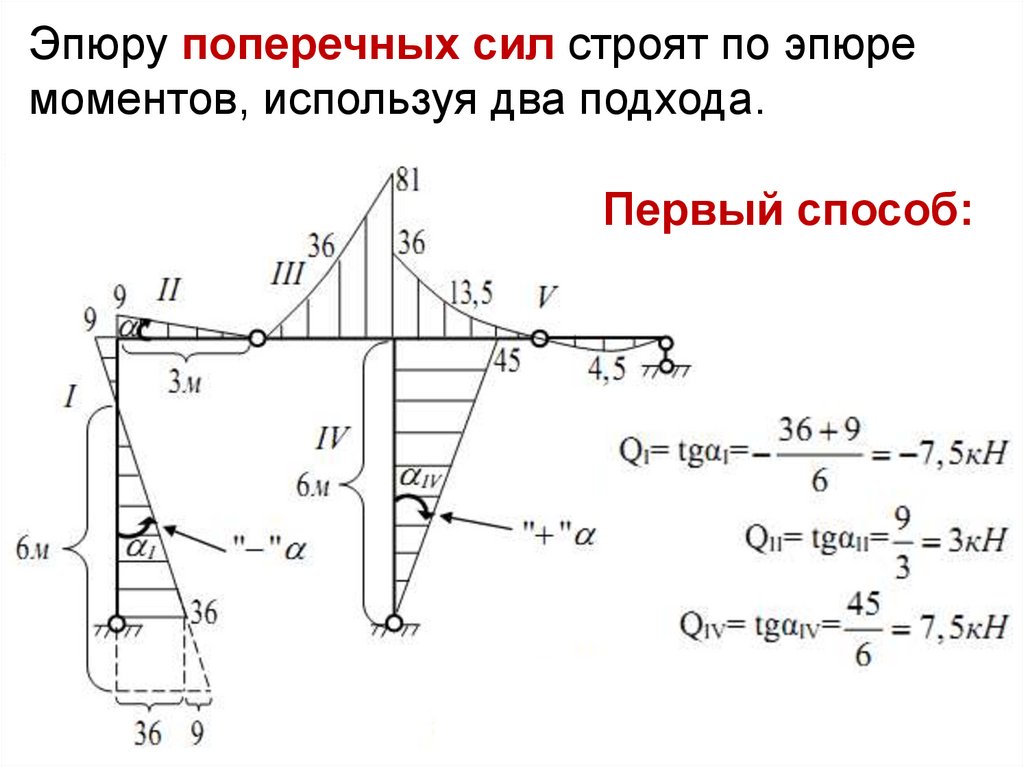 Эпюру поперечных сил строят по эпюремоментов, используя два подхода.