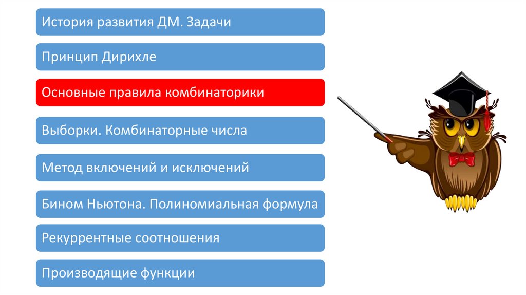 История развития ДМ. Задачи Принцип Дирихле Основные правила комбинаторики Выборки. Комбинаторные числа