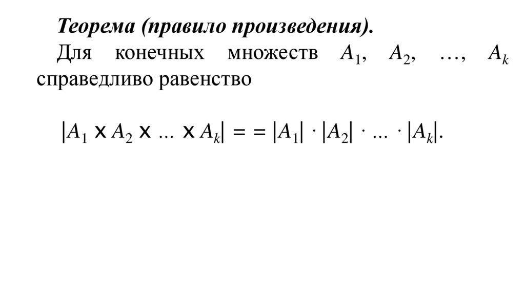 |A1 х A2 х … х Ak| = = |A1| ∙ |A2| ∙ … ∙ |Ak|.