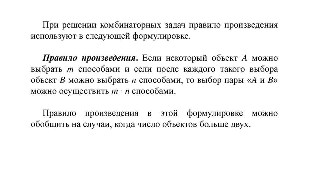 При решении комбинаторных задач правило произведенияиспользуют в следующей формулировке.