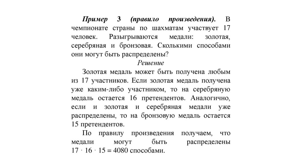 Пример 3 (правило произведения). Вчемпионате страны по шахматам участвует 17