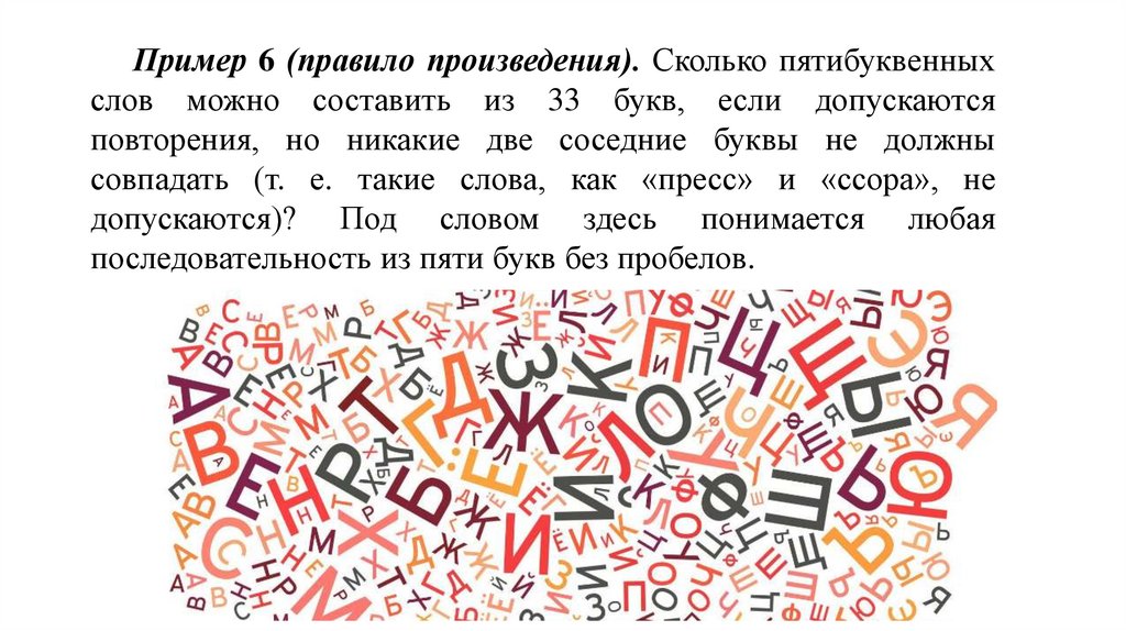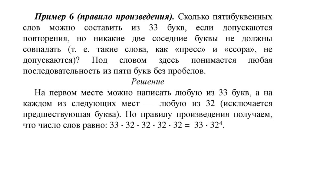 Пример 6 (правило произведения). Сколько пятибуквенныхслов можно составить из 33 букв, если допускаются