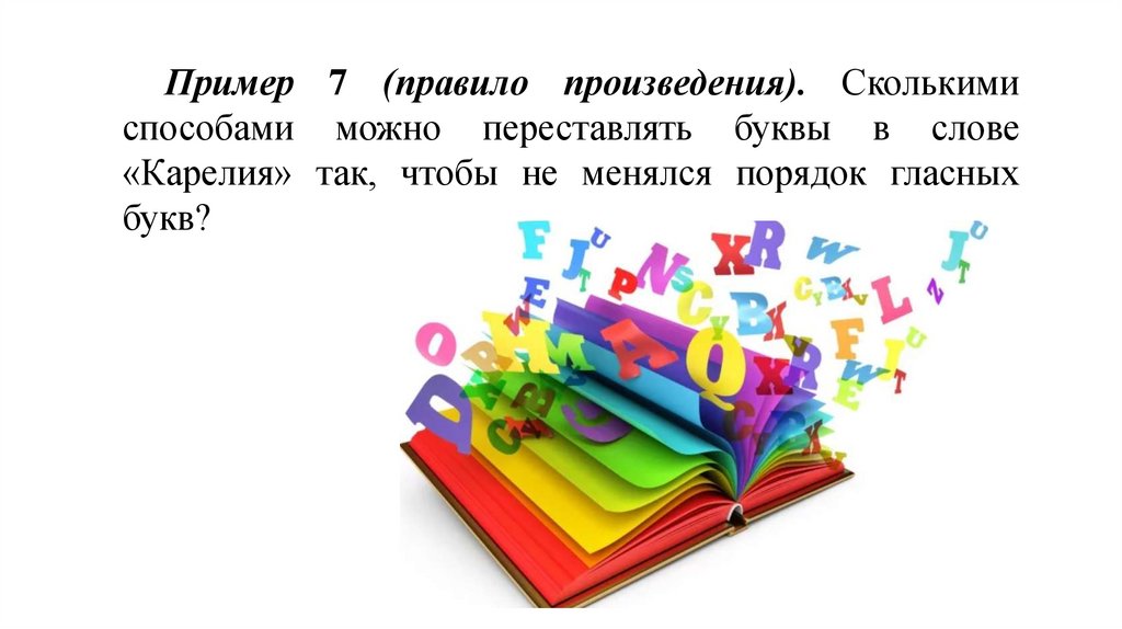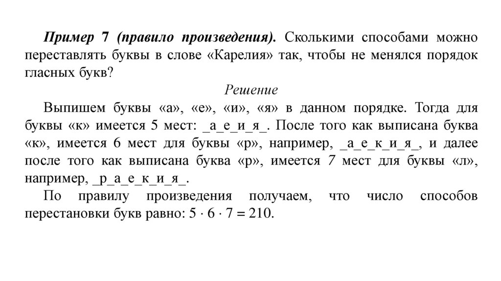 Пример 7 (правило произведения). Сколькими способами можнопереставлять буквы в слове «Карелия» так, чтобы не менялся порядок