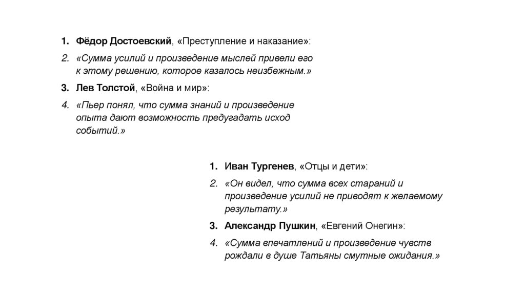 1. Фёдор Достоевский, «Преступление и наказание»:2. «Сумма усилий и произведение мыслей привели его
