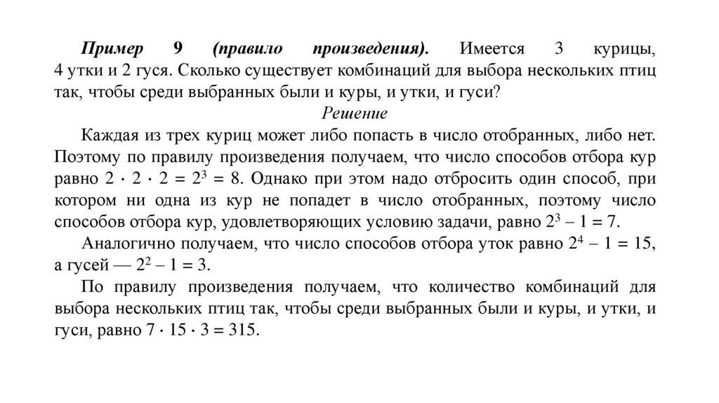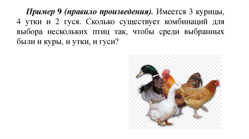Пример 9 (правило произведения). Имеется 3 курицы,4 утки и 2 гуся. Сколько существует комбинаций для