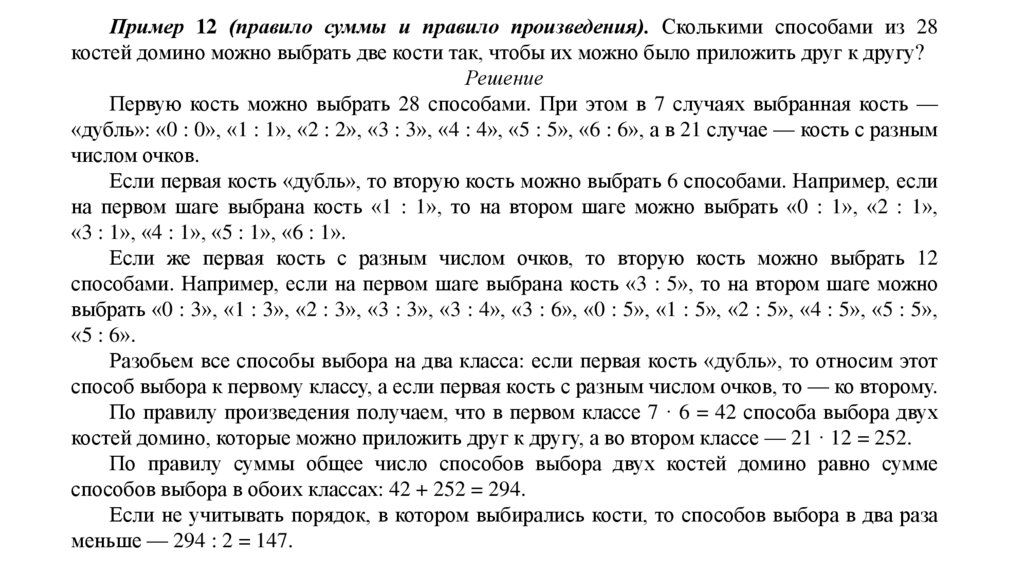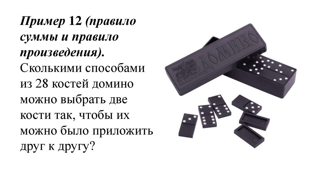 Пример 12 (правило суммы и правило произведения). Сколькими способами из 28костей домино можно выбрать две кости так, чтобы их можно было приложить друг к другу?