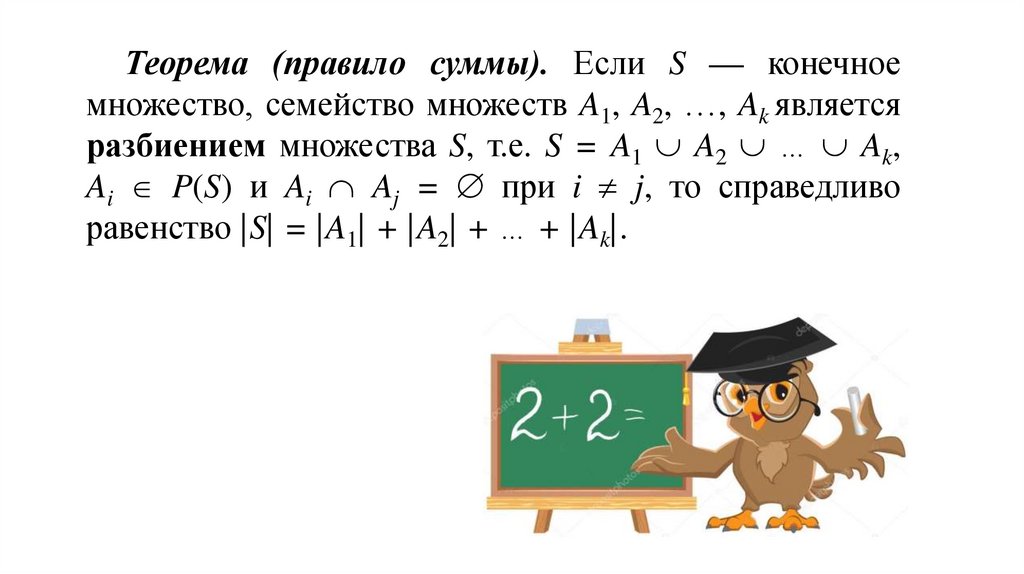 Теорема (правило суммы). Если S — конечноемножество, семейство множеств A1, A2, …, Ak является