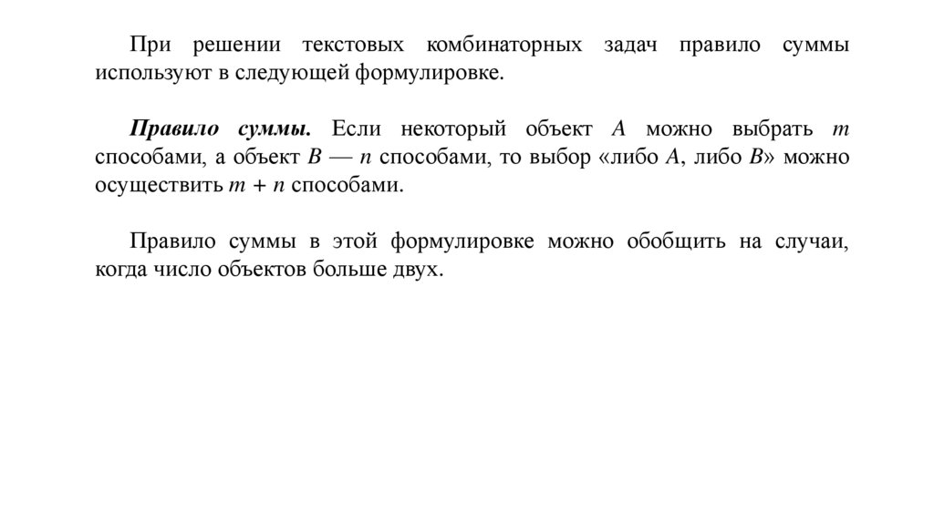 При решении текстовых комбинаторных задач правило суммыиспользуют в следующей формулировке.