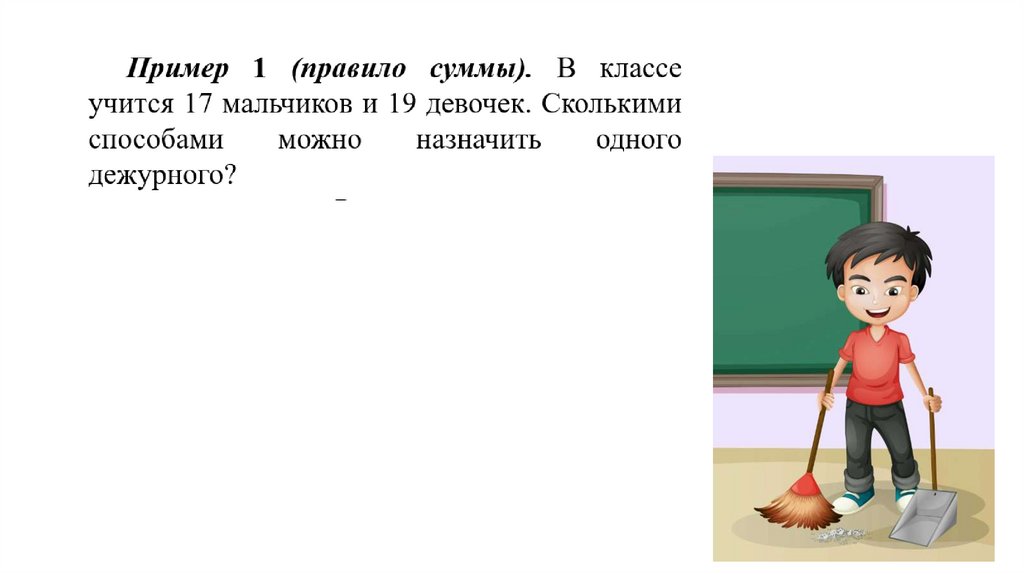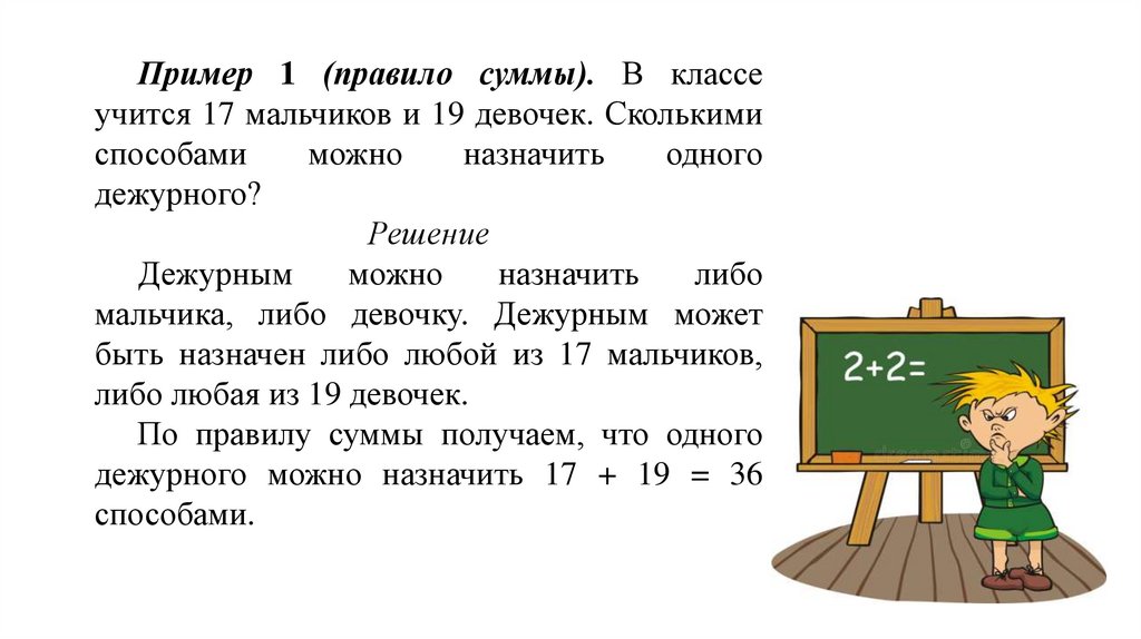 Пример 1 (правило суммы). В классеучится 17 мальчиков и 19 девочек. Сколькими