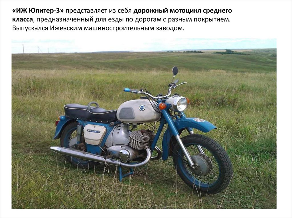 «ИЖ Юпитер-3» представляет из себя дорожный мотоцикл среднегокласса, предназначенный для езды по дорогам с разным покрытием.