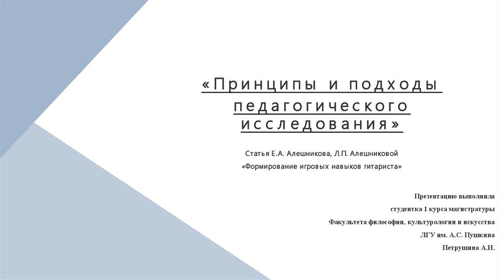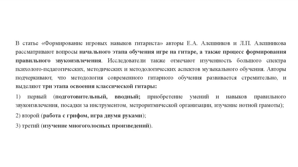 В статье «Формирование игровых навыков гитариста» авторы Е.А. Алешников и Л.П. Алешниковарассматривают вопросы начального этапа обучения игре на гитаре, а также процесс формирования