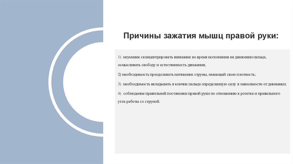 Причины зажатия мышц правой руки:1) неумение сконцентрировать внимание во время исполнения на движении пальца,