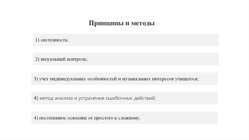 звукоизвлечения, посадки за инструментом, метроритмической организации, изучение нотной грамоты);