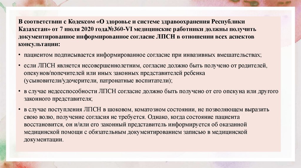 • в случае недееспособности ЛПСН согласие должно быть получено от его опекуна или другого