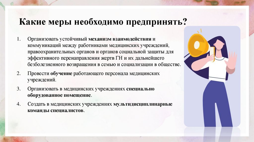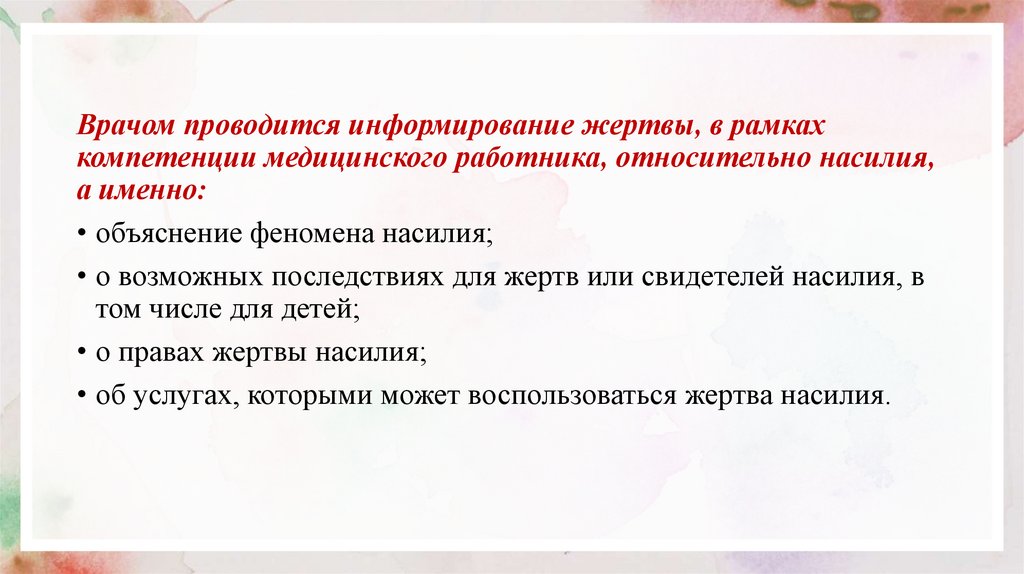 Врачом проводится информирование жертвы, в рамкахкомпетенции медицинского работника, относительно насилия,