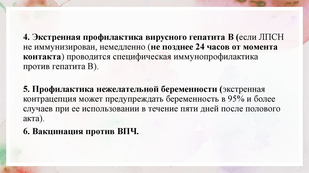 4. Экстренная профилактика вирусного гепатита В (если ЛПСНне иммунизирован, немедленно (не позднее 24 часов от момента