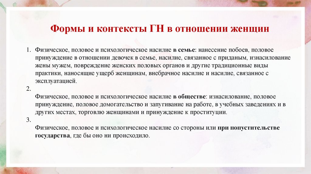 Формы и контексты ГН в отношении женщин1. Физическое, половое и психологическое насилие в семье: нанесение побоев, половое