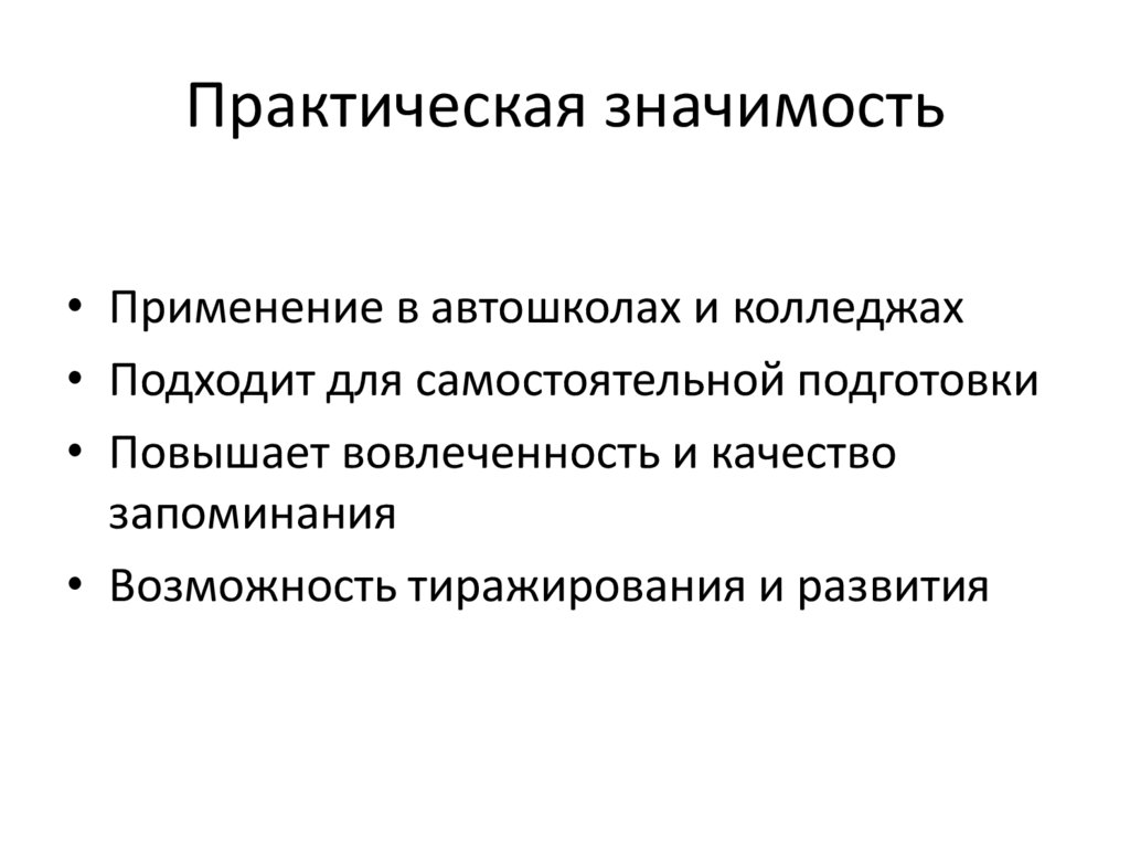 Практическая значимость• Применение в автошколах и колледжах