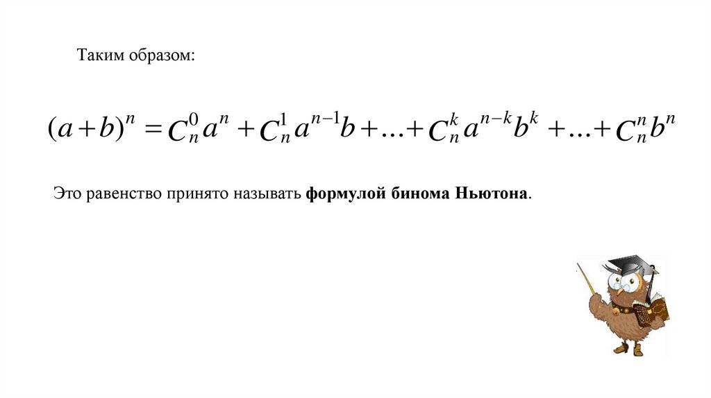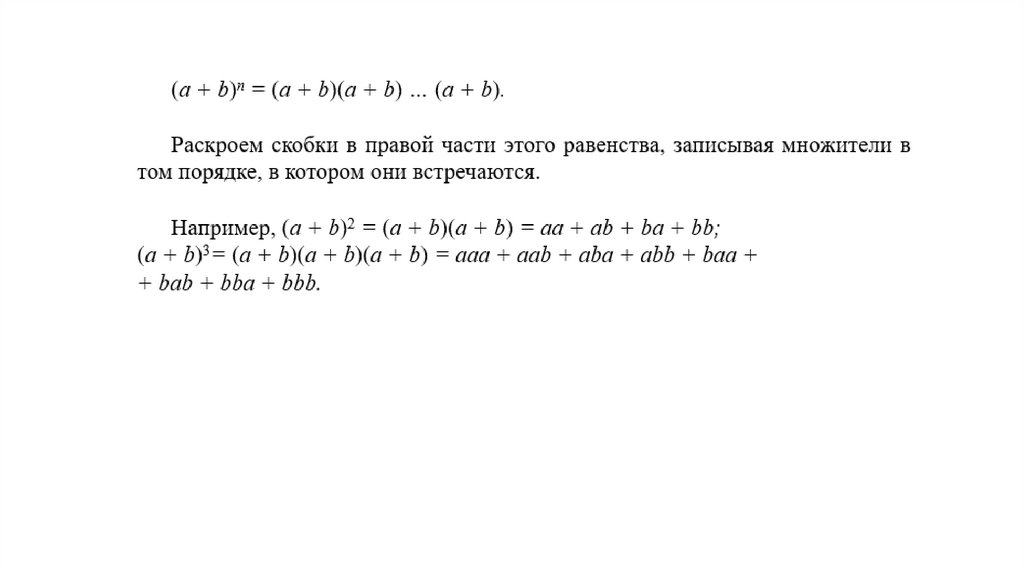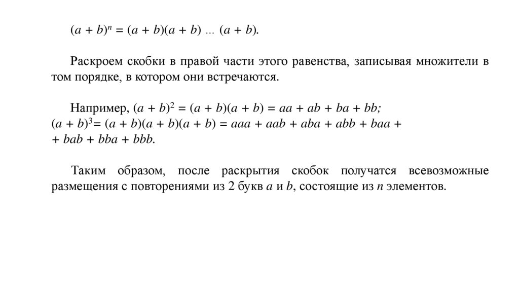 (a + b)n = (a + b)(a + b) … (a + b).Раскроем скобки в правой части этого равенства, записывая множители в