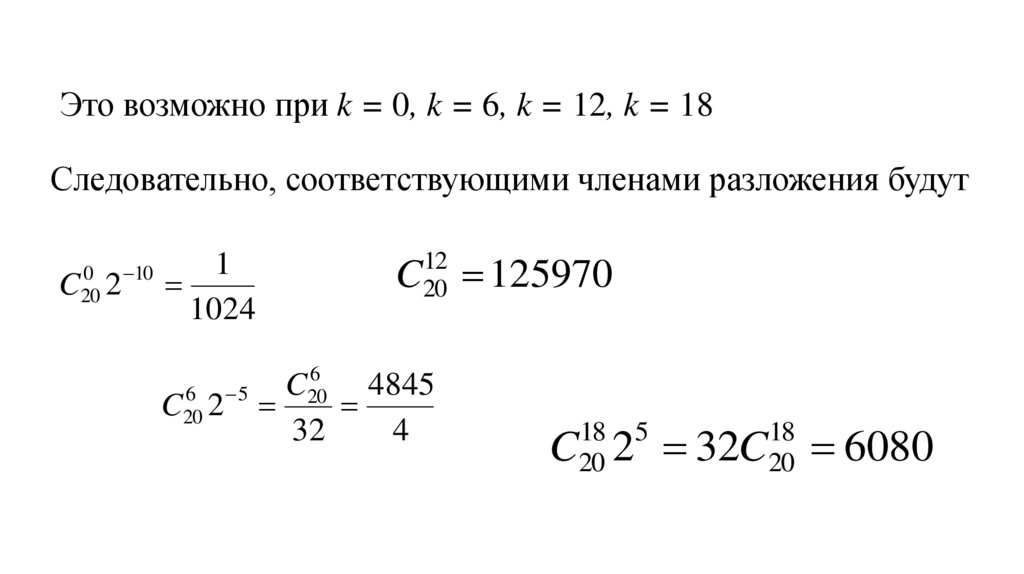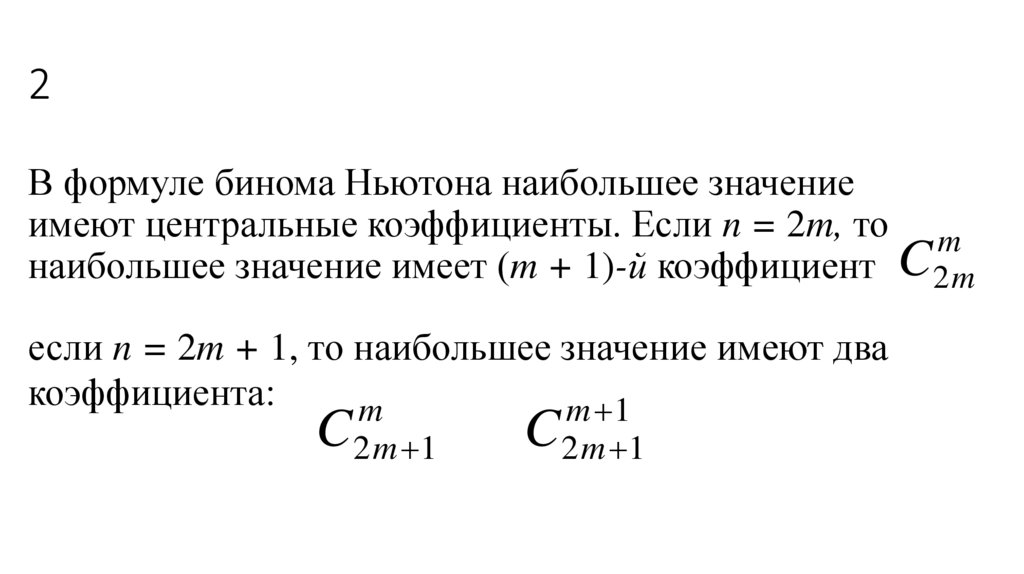 16. 2 В формуле бинома Ньютона наибольшее значение имеют центральные коэффициенты. Если n = 2m, то наибольшее значение имеет