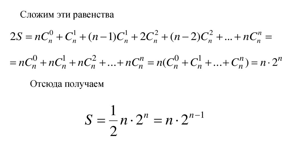 Сложим эти равенства2S nC C (n 1)C 2C (n 2)C ... nC