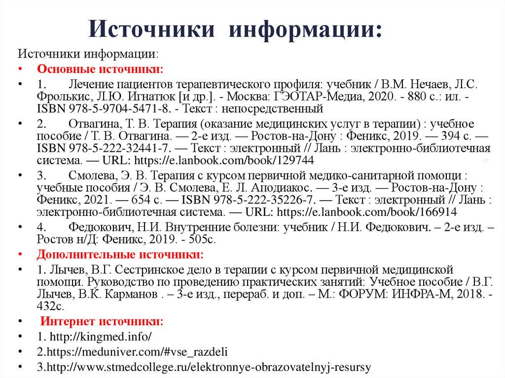 1. Лычев, В.Г. Сестринское дело в терапии с курсом первичной медицинской