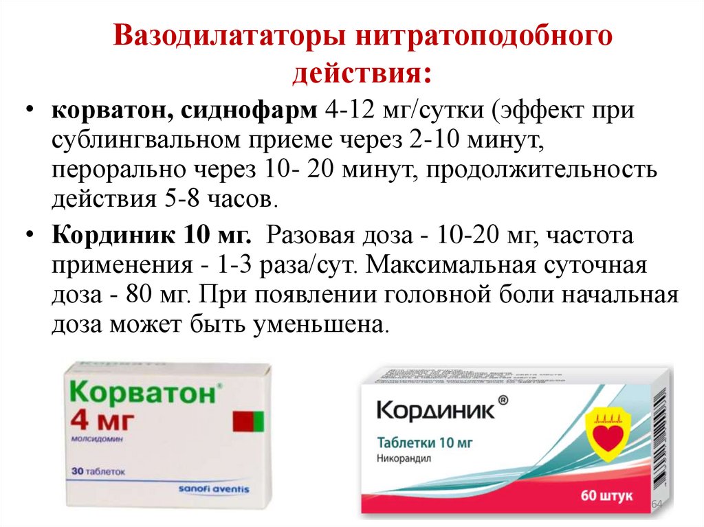 • корватон, сиднофарм 4-12 мг/сутки (эффект присублингвальном приеме через 2-10 минут,