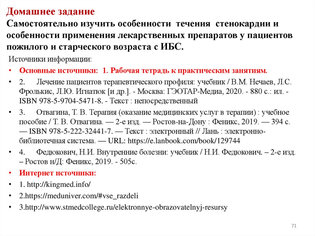 71. Домашнее задание Самостоятельно изучить особенности течения стенокардии и особенности применения лекарственных препаратов у
