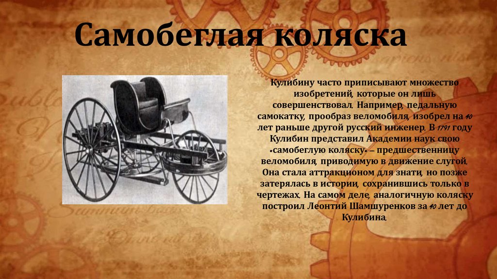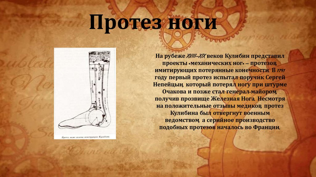 Протез ногиНа рубеже XVIII—XIX веков Кулибин представил