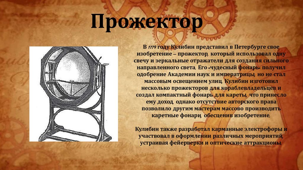 ПрожекторВ 1779 году Кулибин представил в Петербурге свое