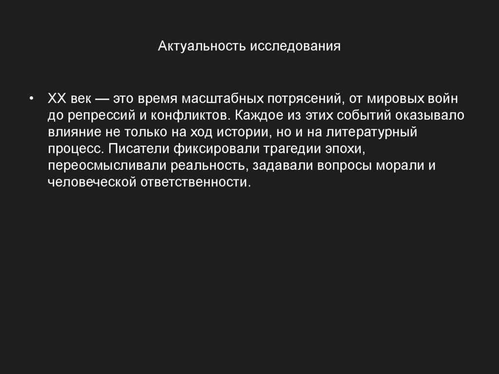 Актуальность исследования• XX век — это время масштабных потрясений, от мировых войн