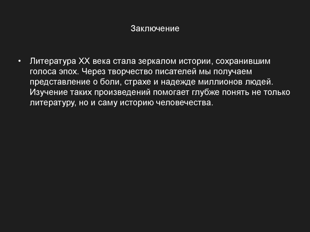 Заключение• Литература XX века стала зеркалом истории, сохранившим