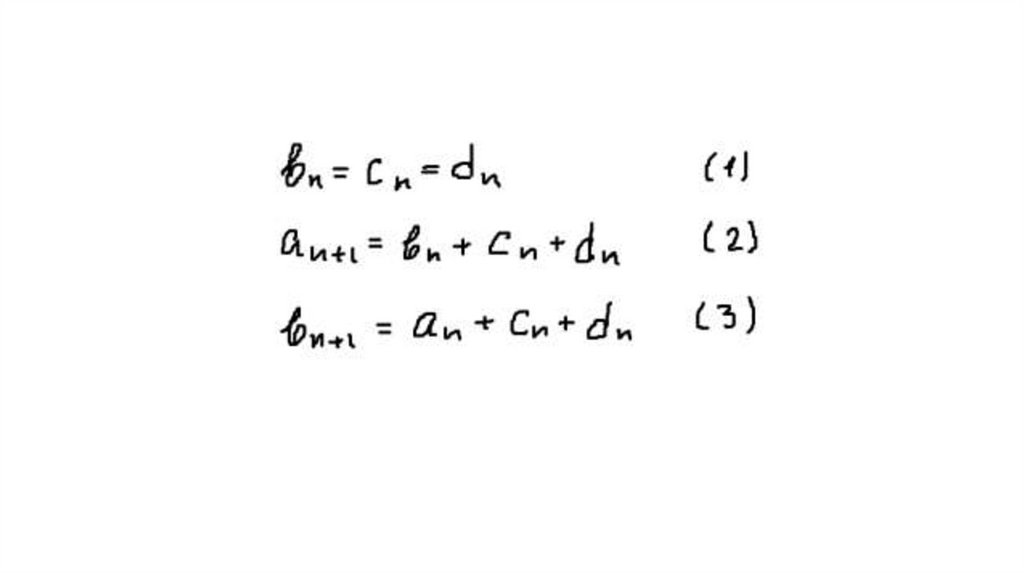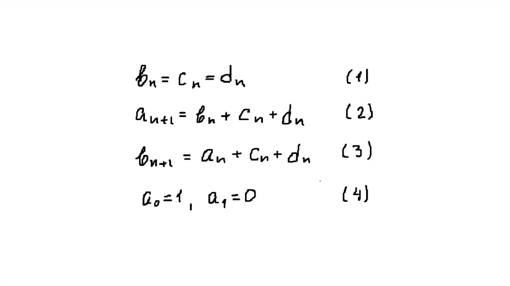 10. Обозначим аn – число замкнутых маршрутов длины n из А в А, bn - число маршрутов из А в В, сn - из А в С, dn - из А в D.